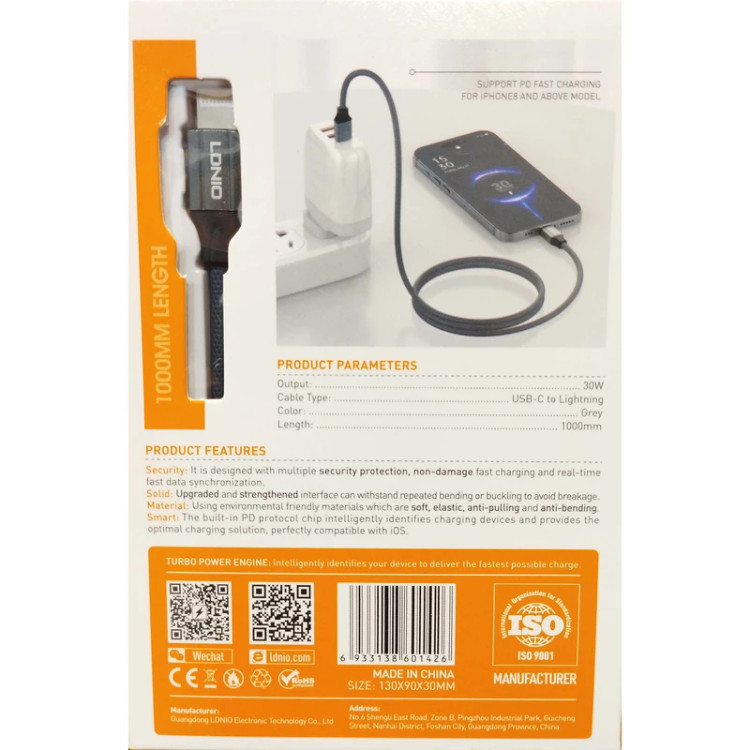کابل شارژ تایپ سی به لایتنینگ آیفون الدینیو LC441i مقاوم در برابر نوسانات ولتاژ آداپتور و گلکی شارژ است و توان خروجی آن 30 وات می باشد.