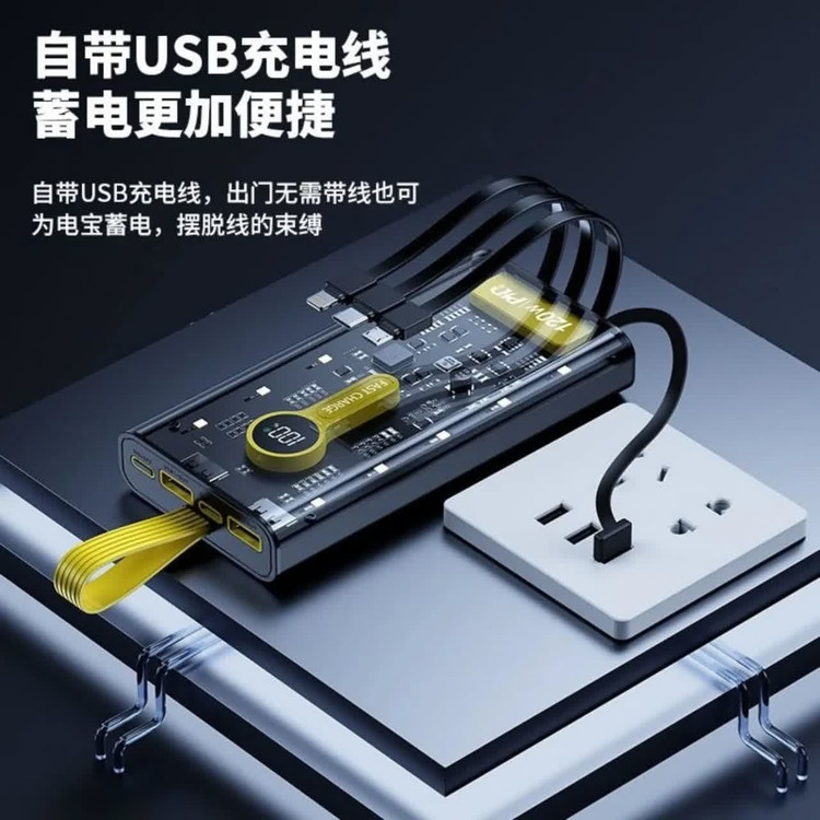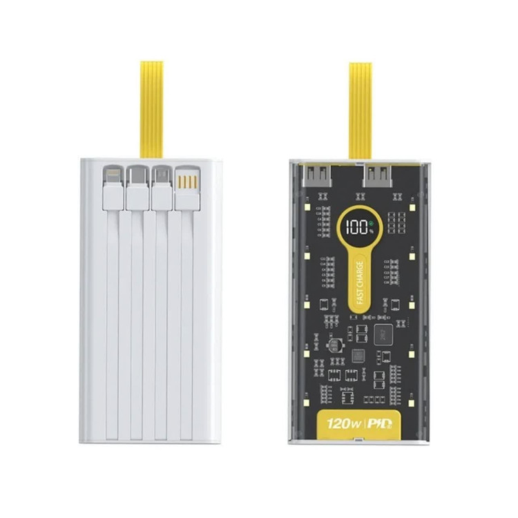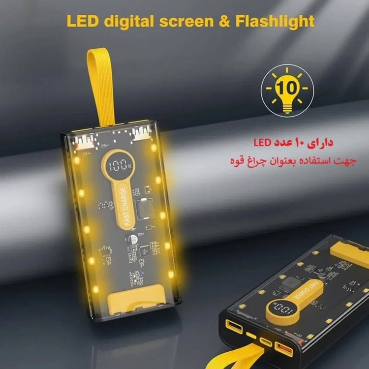مجهز به ۴ کابل شارژ متصل برای راحتی بیشتر و کاهش نیاز به حمل کابلهای اضافی. پورتهای متنوع: مجهز به دو پورت USB و یک پورت Type-C برای سازگاری با انواع دستگاهها