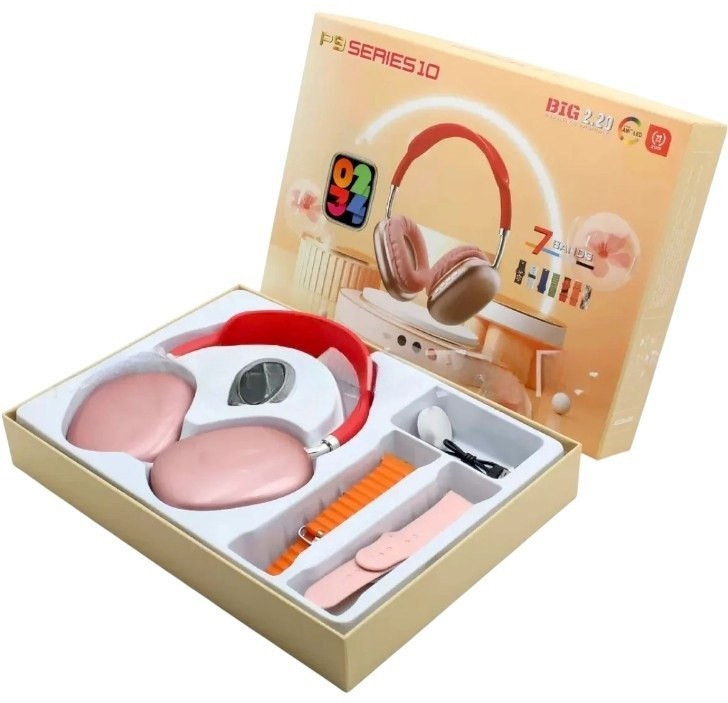 پک ویژه و اقتصادی ساعت هوشمند مدل P10 دارای یک عدد ساعت سری10، هدفون بلوتوثی و تعداد 7 بند سیلیکونی، پارچه ای و کشی در طرحها و رنگهای متنوع می باشد. ساعت p9 series 10 از صفحه نمایش لمسی و با کیفیتی برخوردار است. یک عدد هدفون بیسیم نیز داخل پک قرار داده شده است که میتوانید مکالمه و موزیک انجام دهید. ساعت p9 از زبان فارسی پشتیبانی می کند. قابلیت برقراری مکالمه بلوتوثی، دریافت اعلان و پیامک، پخش موزیک، مجهز بودن به سنسورهای سلامتی و ورزشی مانند پایش ضربان قلب، فشارخون، اکسیژن خون، گام شمار، دوچرخه سواری، کوهنوردی، فوتبال و... از امکانات ویژه این ساعت هوشمند می باشد. این ساعت از طریق شارژ بیسیم وایراس شارژ و تغذیه می شود.